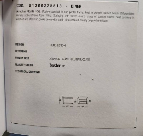 De Baxter Diner chairs zijn onbeschadigd en nog in nette, maar gebruikte staat. Het leer is zacht en soepel. Het leer was oorspronkelijk donkerder(zie foto zonder kussens) en is nu licht grijs. Komt overeen met foto van internet