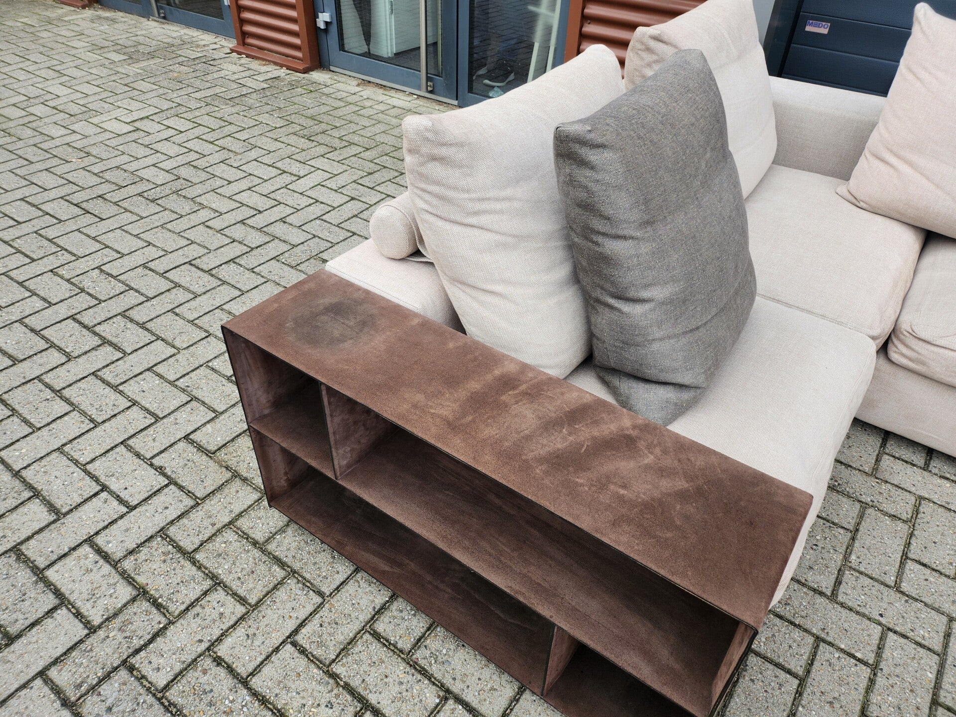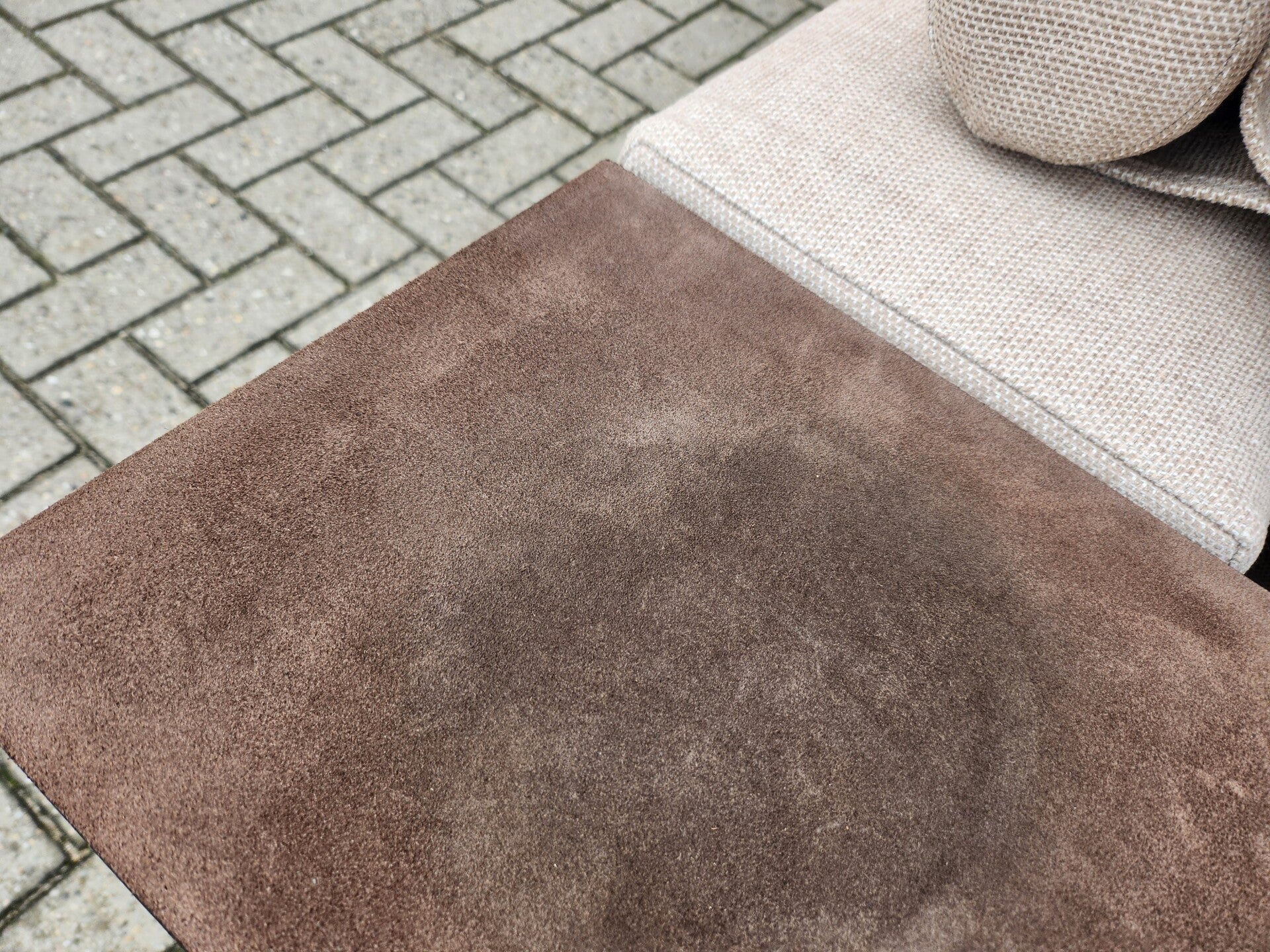 De flexform bank is in mooie staat.Normale gebruiksporen. De kussens zijn in perfecte staat. De suede armleuning heeft gebruiksporen. Ronde plek/vlek van een tafellamp.