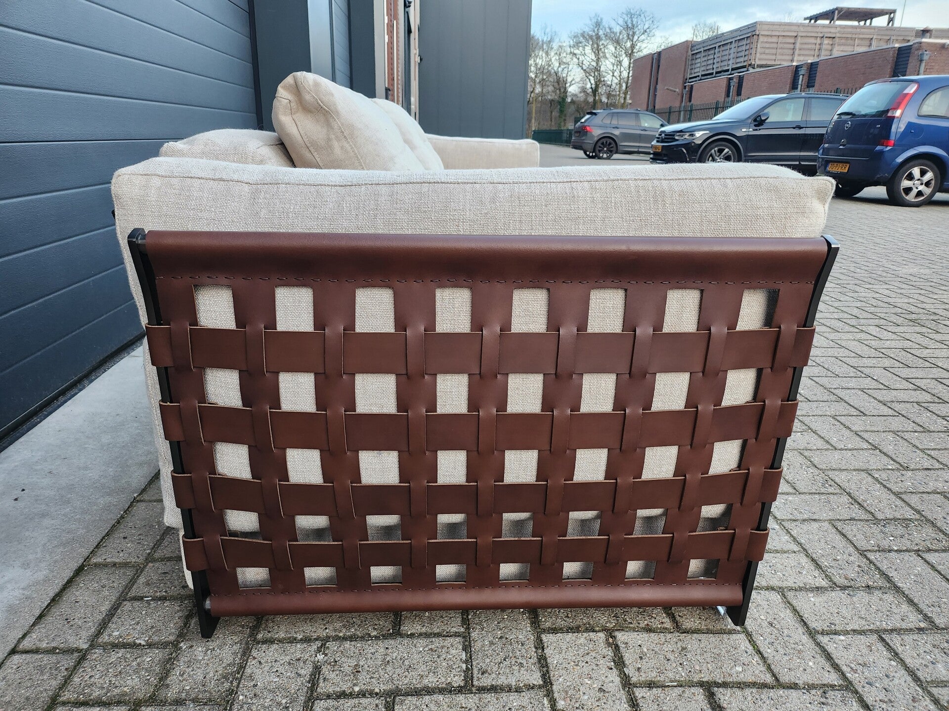 De Cestone sofa van Flexform heeft zijn eigen karakter. De bank bestaat uit een vaste sofa. De zijkanten en rug met gewoven leer zijn uniek in zijn soort. De Cestone heeft een metalen kern en donzen kussens.